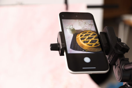Shooting tasty pie and milk with smartphone in studio, selective focus. Professional food photography