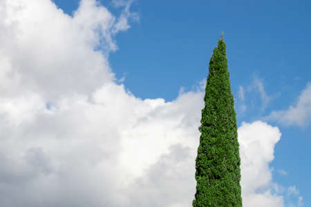 Lonely cypress against a beautiful sky. View from below on a good autumn day.