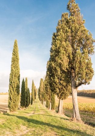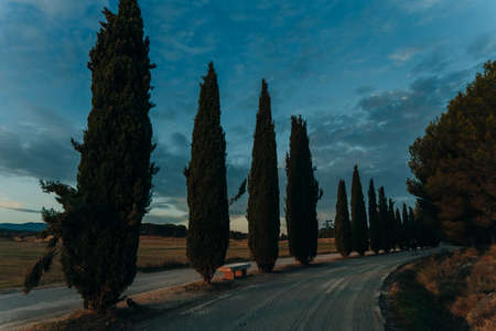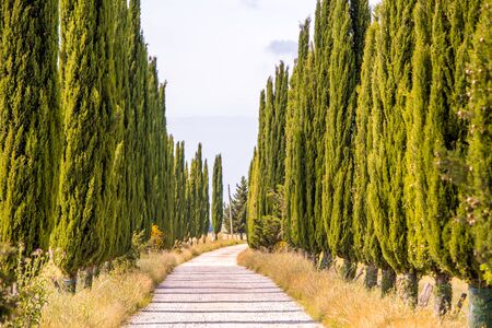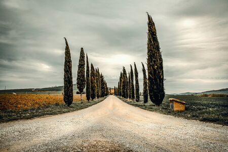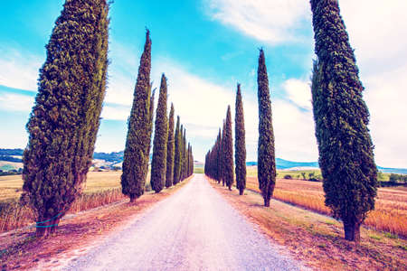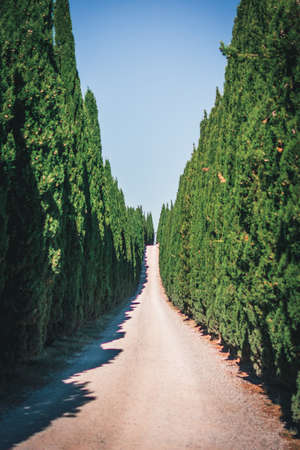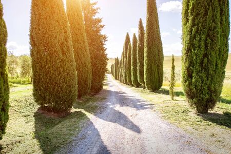 Mood fall photo of Tuscany landscape. A straight road among the tall trees. Empty space background for you products and decoration.