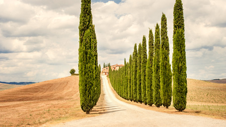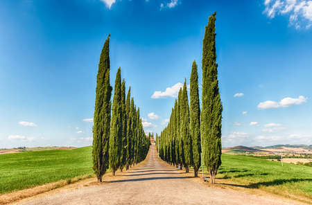 Italian cypress trees alley and a white road to farmhouse in rural landscape. Italian countryside of Tuscany, Italy, Europe.