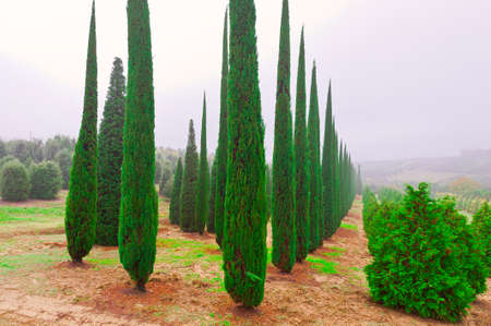 Cypress Trees in the Nursery Garden in Tuscany in a Rainy Day