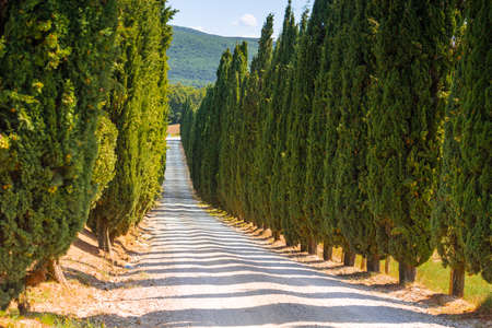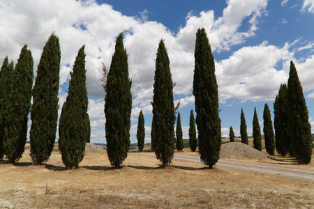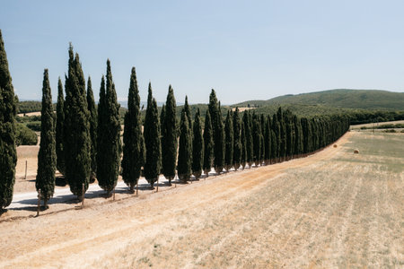 Straight row of cypress trees bordering a dirt road in the tuscan countryside, creating a scenic view under the summer sun