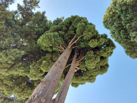Shaped crowns of cypress trees in Buen Retiro Park, Madrid, Spain. View from below with blue sky