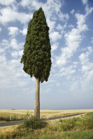 One cypress tree in field in Tuscany, Italy.