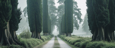 AI Generated. Cypress Tree Tunnel with Natural Landscape Pathway and Empty Space for Text in Peaceful Nature Setting