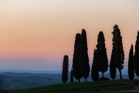 Cypresses silhouettes in Tuscany (Italy), agains a beautiful coloured sky at dusk.