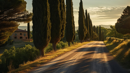 This captivating image showcases a long road flanked by tall cypress trees, offering a picturesque view of the Italian countryside bathed in sunlight.