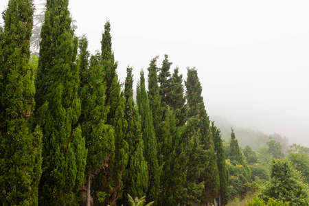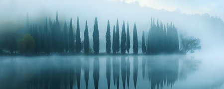 Cypress during the morning fog. Idyptic landscape.