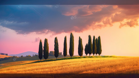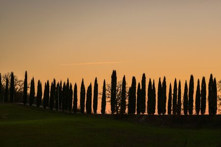 Cypress trees on the field in Tuscany, Italy at sunset. Tuscan landscape in vintage, retro mood