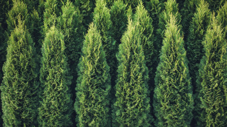Green hedge of thuja trees forming a neat and orderly row. Lush, vibrant foliage perfect for natural and garden-themed imagery.