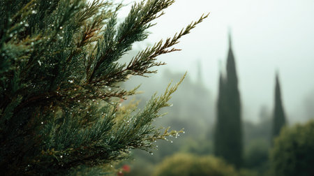 The Italian cypress in light fog, dew on leaves, light soft diffused, three-quarter view