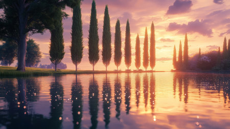 Row of cypress trees by a tranquil lake, water drops falling gently from branches into the water, soft sunset glow, generative ai