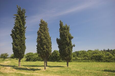 Three cypress trees in the middle of a croatian meadow