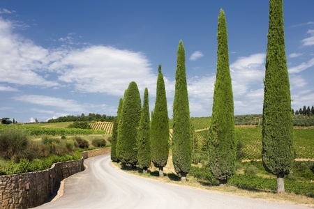 Rows of Italian cypress trees along a white gravel rural road in the Chianti region of Tuscany, Italy, Europe.
