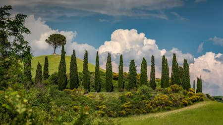 SAN QUIRICO D'ORCIA, ITALY - JUNE 23: Iconic group of cypresses in San Quirico d'Orcia, province of Siena, Tuscany, Italy, as seen on June 23, 2019