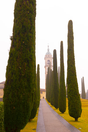 Walkway with Cypress Tree and Parish of Sant'Abbondio in Montagnola in Ticino, Switzerland.