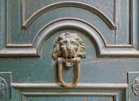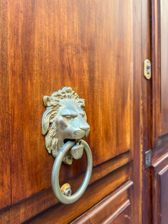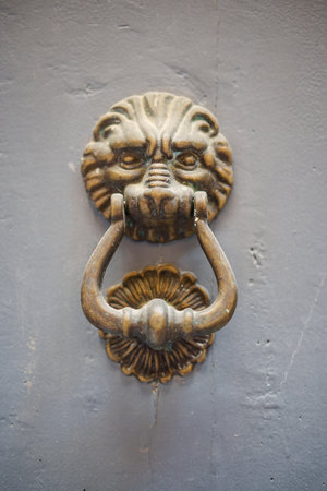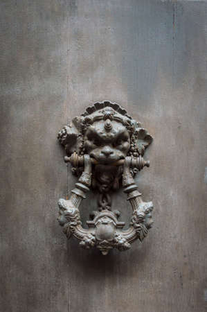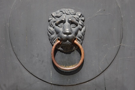 A door knocker is a fixture on the front door of a house. It is made of metal and has the form of a ring, which is knocked on the metal part of the door knocker fixed to the wall. Muzzle of a lion