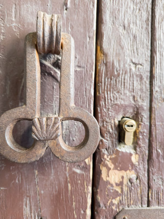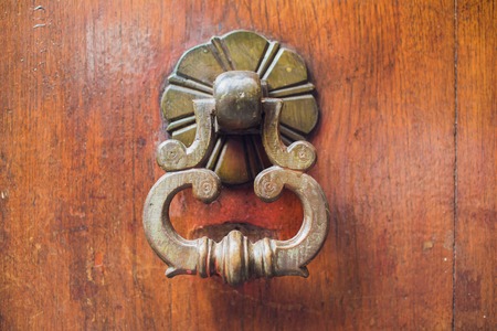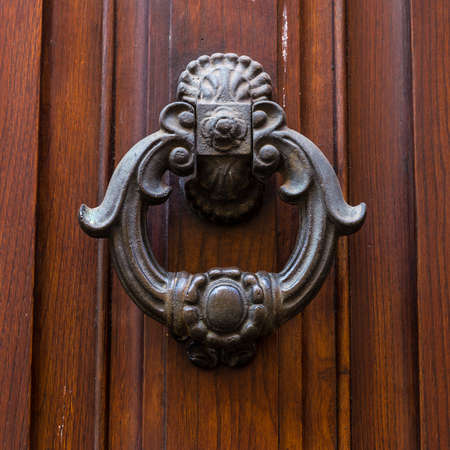 Closeup of a bronze door handle on a brown door in Venice (Italy)