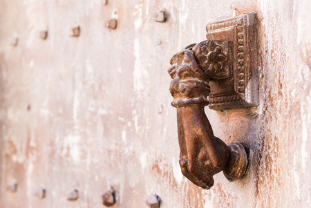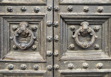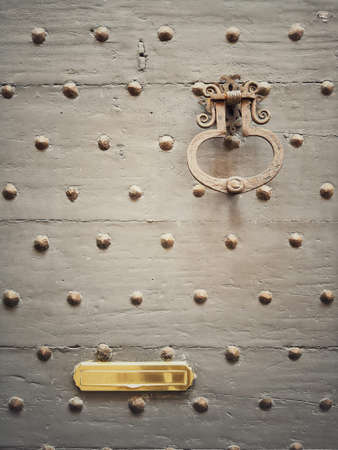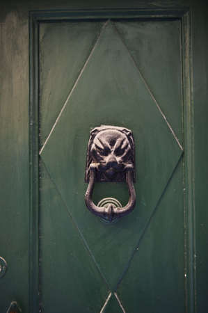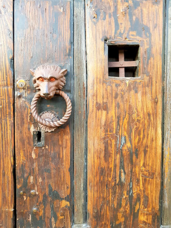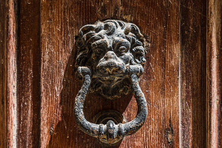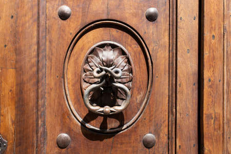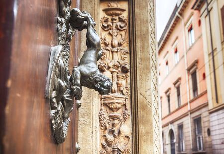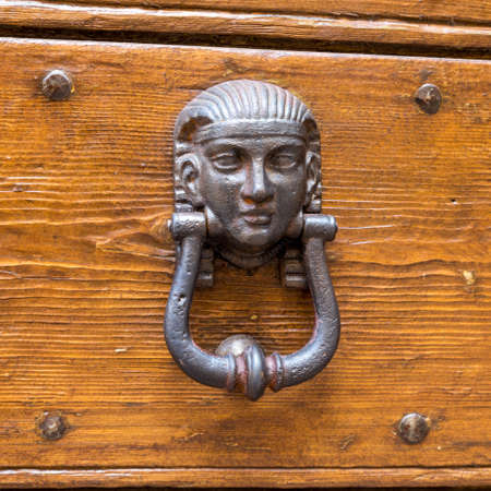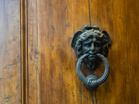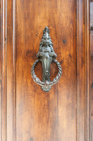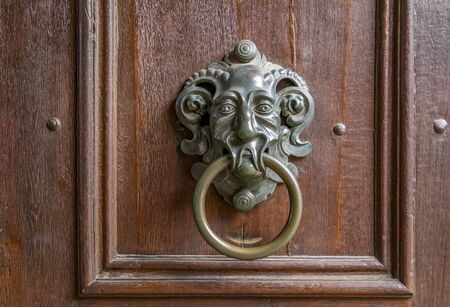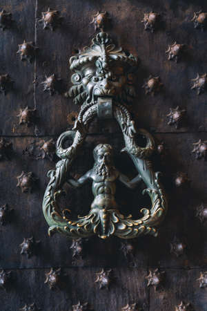 Ornate bronze door knocker with mythological figure on studded medieval wooden door in the historic center of Genoa