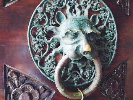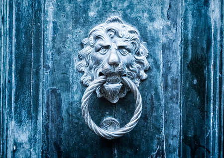 Close-up of an antique metal doorknob with a lion on a wooden door. Concept for antique, gothic, mistery