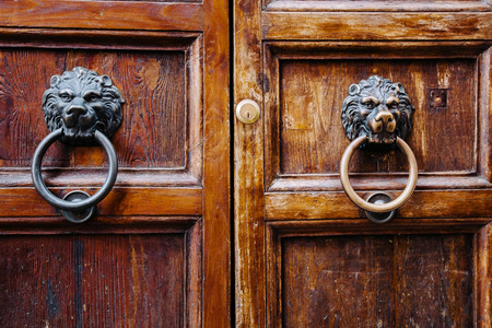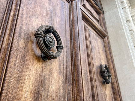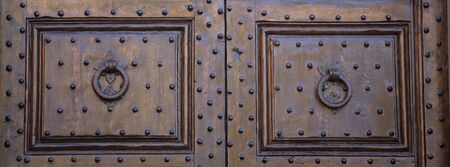 door, wooden door with circle doorknobs or knockers. main entrance of a building. closeup doorknobs or handles at the entrance of a house or building with selective focus. exterior of a house
