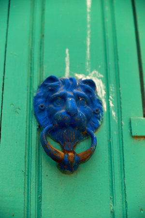 A Pair of Old Metal Poseidon Shaped Knockers on Wooden Door in Mdina, Malta. Blue and yellow coloring filter used