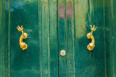 Texture of an old wooden wooden door with metal handles in the form of a dolphin on the island of Malta