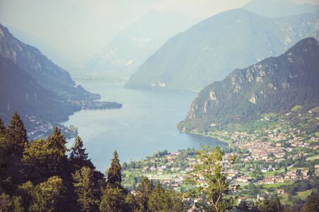 Photo of foggy mountains in Como lake in Lombardy, Italy. Sunset view over the mountain