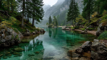 Panorama of famous Lago di Braies lake in Italy on a foggy weather with beautiful reflections of the mountains in autumn season