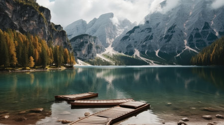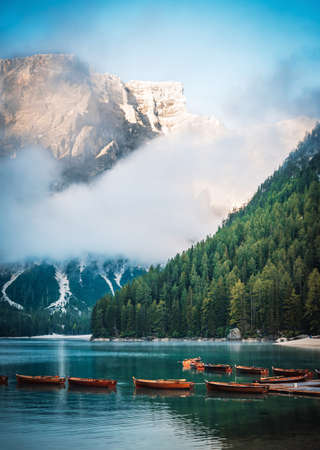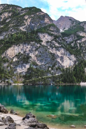 Lake Braies landscape, lake crystal water in background of mountain in morning.