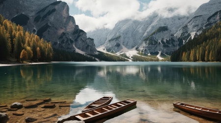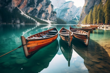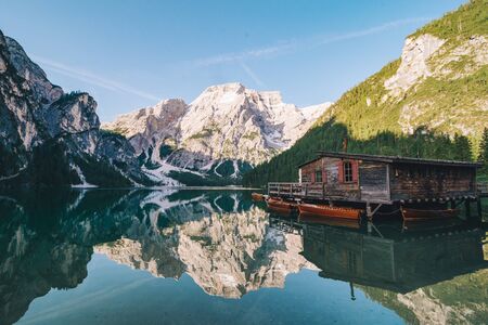 view of wooden boat station at alpine high mountain lake braies pragser wildsee. north italy