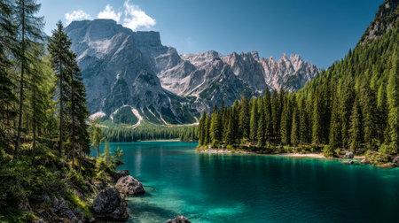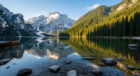 landscape view of braies lake in dolomites mountains in italy. background