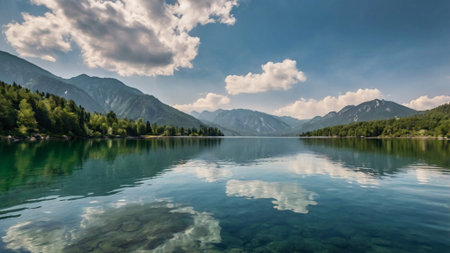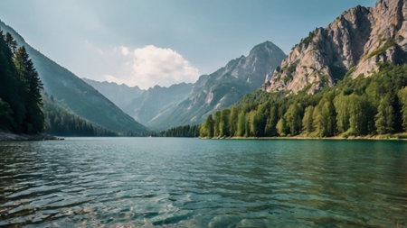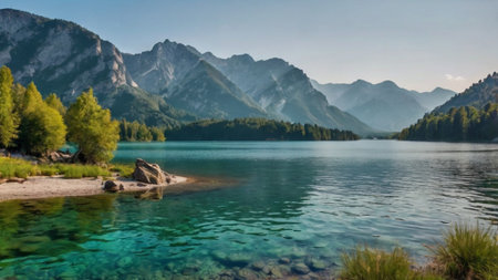 Panoramic view of alpine lake with crystal clear water.