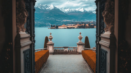 Experience a breathtaking view from an elegant balcony overlooking a tranquil lake, framed by majestic mountains and lush gardens. Perfect for travel themes.