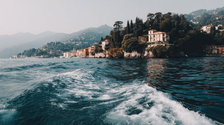 View from a moving boat showing a distinct white wake trailing across dark blue water in the foreground. In the background, a densely vegetated slope rises from the water, featuring traditional European architecture, including prominent villas situated near the shoreline and extending up the misty hillsides under bright, hazy daylight.