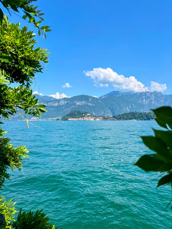 A distant view of the town of Bellagio across the vast expanse of Lake Como, framed by lush green leaves in the foreground, under a beautiful blue sky with fluffy white clouds.