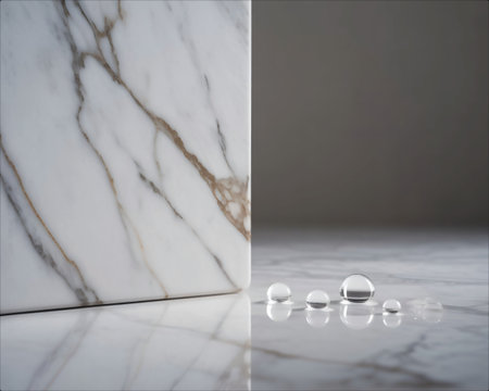 Close-up shot of several clear water droplets resting on a smooth, polished white marble surface, reflecting the surrounding environment.