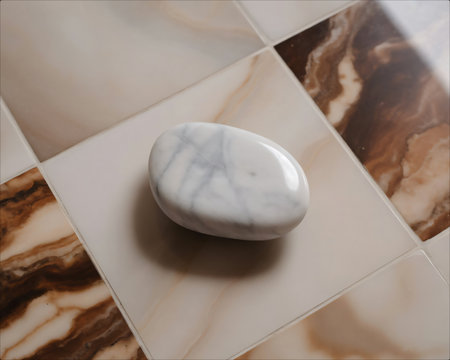 A close-up, high-angle shot of a smooth, polished white stone with subtle grey veins, resting on a beige and brown tiled surface, creating a minimalist and natural aesthetic.