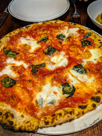 Neapolitan Pizza made with tomatoes, basil and mozzarella cheese.