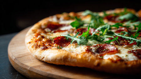 close-up of delicious pizza with arugula. top view of a detail of the pizza