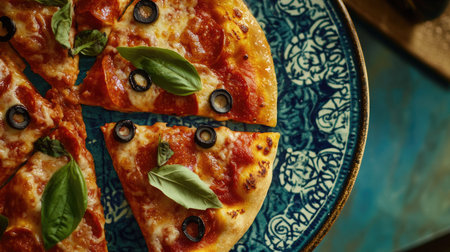 Rustic pizza with salami, mozzarella, olives and basil top view with copy space.