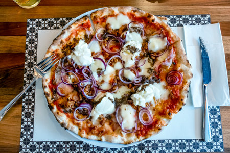 Pizza with truffle and onions with mascarpone and burrata, tomato sauce, on a plate with utensils on restaurant table