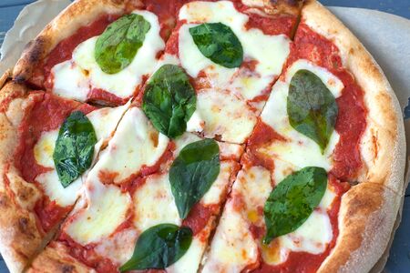 Close-Up Delicious Pizza on wooden cutting board top view. Mediterranean cheese snack, fast food, flour product. Fresh vegetarian nutrition. Italian pizza Margherita with Basil.