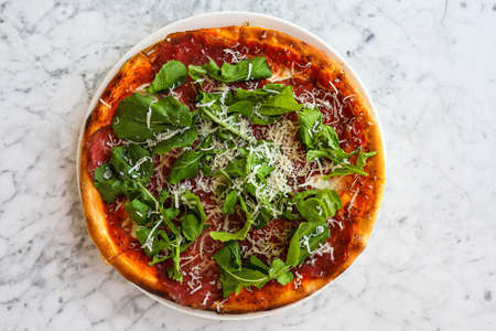 Italian pizza with prosciutto, rocket, mozzarela and parmesan
