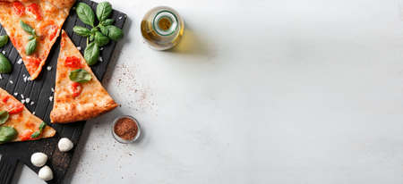 Slices of italian pizza margherita with oil, top view