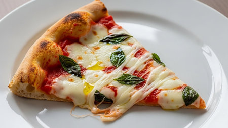A delicious slice of pizza on a white plate with melted cheese and basil leaves