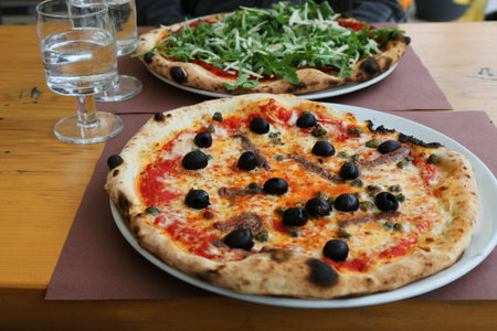 Italian pizzas freshly served in a restaurant in Friuli Venezia Giulia region in Italy. Pizza toppings: mozzarella cheese, anchovies, black olives and capers.