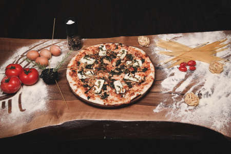 Appetizing pizza on a wooden table surrounded by herbs and spices. The concept of delicious food, restaurants and cafes