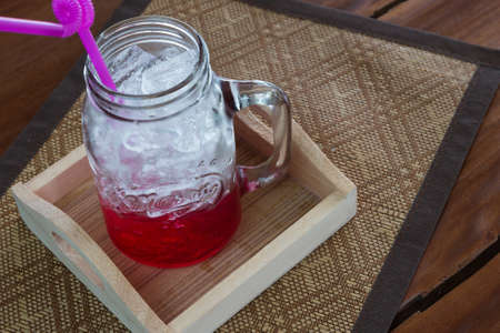 Mixed red syrup and soda with ice cubes on wood table
