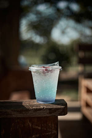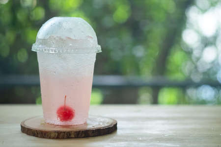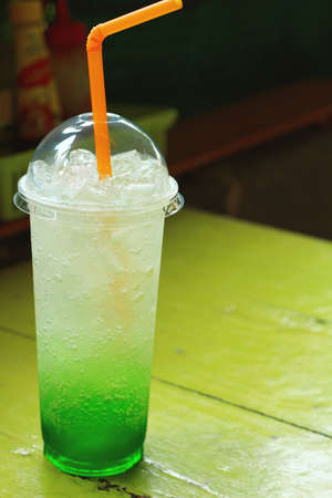 Apple soda with ice in plastic glass on the table wooden